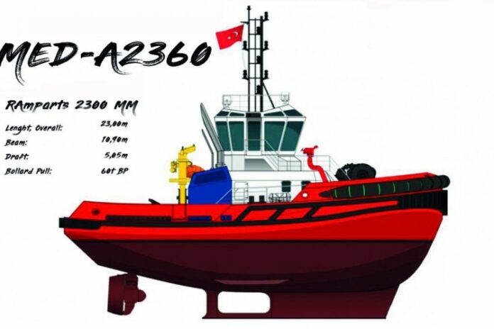 MED-A2360 series tug having different bollard pull options is Robert Allan’s RAmparts 2300-MM that is designed exclusively for Med Marine by Canadian tug designer.